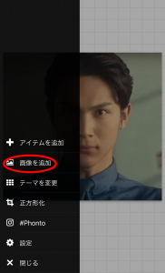 - ベース画像が表示されたら、左側のメニューをタップして「画像を追加」をタップ。予め保存しておいた黄金比マスクを選択します。