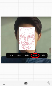 - 顔と合わせるためにマスクの画像を一度タップして、表示された「透明度」というメニューを選択します。