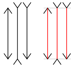 これは全て同じ長さの直線ですが、上下の形が変わるだけで長さが違って見えるというわけなんです。左の画像を見てもらえれば分かりますが、真ん中の線が左右よりも長く見えますよね。