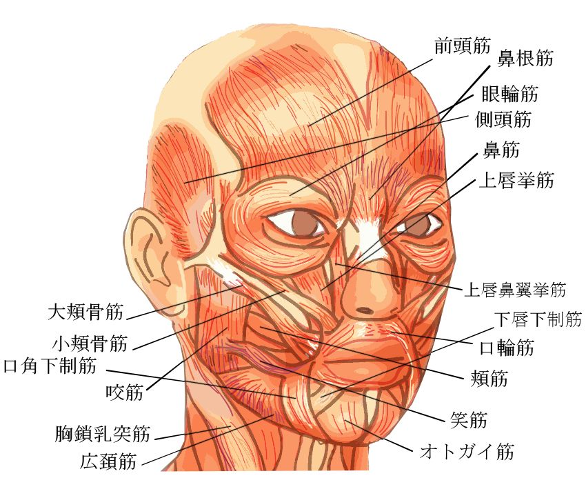 図を見てもらえればわかると思いますが、これだけの様々な表情筋が口の周りには密集しています。